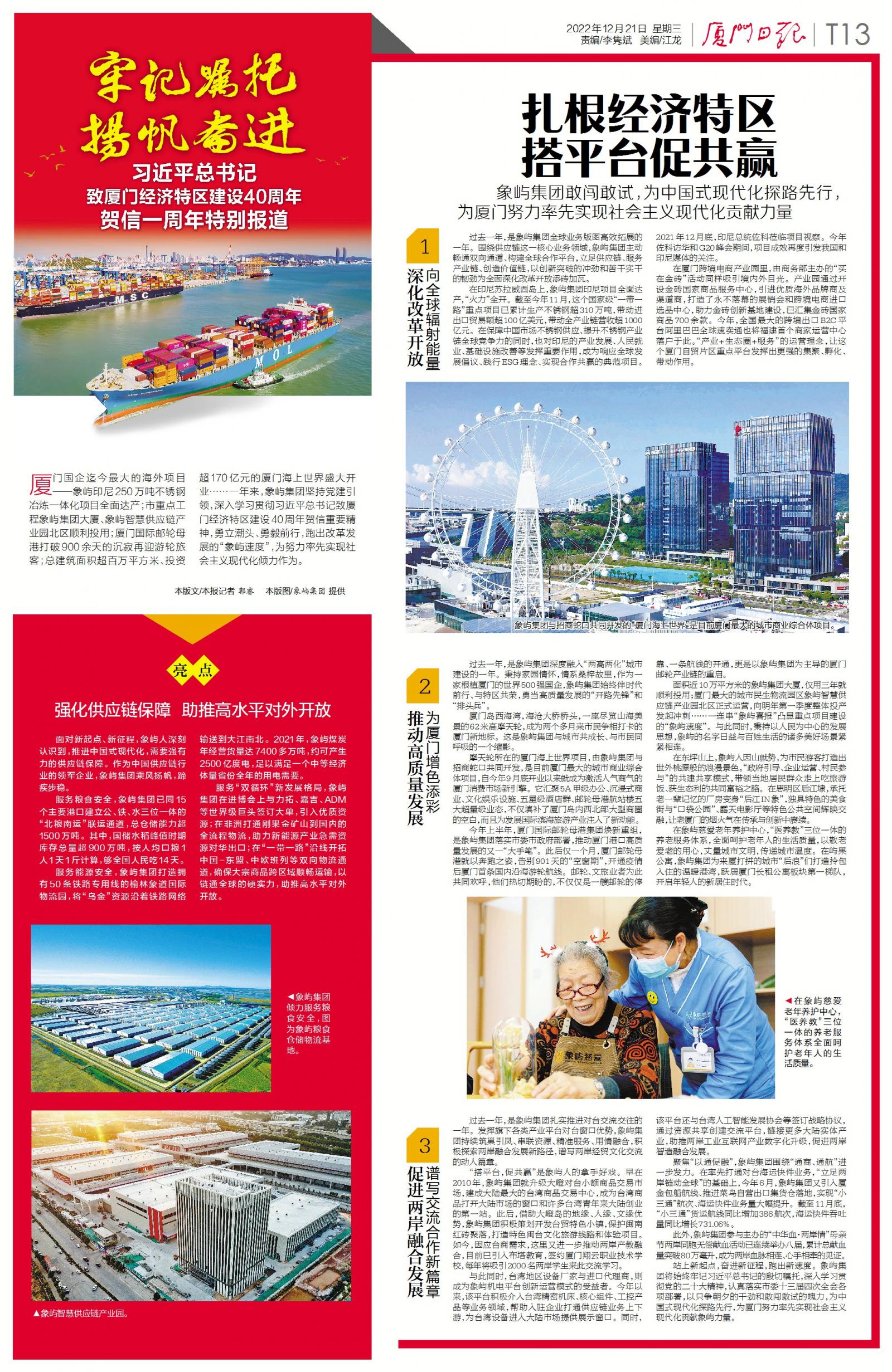 廈門國(guó)企迄今最大的海外項(xiàng)目——象嶼印尼250萬(wàn)噸不銹鋼冶煉一體化項(xiàng)目全面達(dá)產(chǎn);市重點(diǎn)工程象嶼集團(tuán)大廈、象嶼智慧供應(yīng)鏈產(chǎn)業(yè)園北區(qū)順利投用;廈門國(guó)際郵輪母港打破900余天的沉寂再迎游輪旅客;總建筑面積超百萬(wàn)方、投資超170億元的廈門海上世界盛大開業(yè)……一年來(lái),象嶼集團(tuán)堅(jiān)持黨建引領(lǐng),深入學(xué)習(xí)貫徹習(xí)近平總書記致廈門經(jīng)濟(jì)特區(qū)建設(shè)40周年賀信重要精神,勇立潮頭、勇毅前行,跑出改革發(fā)展的“象嶼速度”,為努力率先實(shí)現(xiàn)社會(huì)主義現(xiàn)代化傾力作為。今天,廈門日?qǐng)?bào)推出特刊《牢記囑托 揚(yáng)帆奮進(jìn) 習(xí)近平總書記致廈門經(jīng)濟(jì)特區(qū)建設(shè)40周年賀信一周年特別報(bào)道》,現(xiàn)全文轉(zhuǎn)載如下。