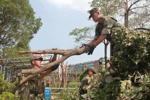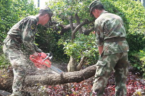 9月19日,子弟兵來(lái)了。這群已經(jīng)為廈門奮戰(zhàn)四天四夜的親人,來(lái)到廈門國(guó)際航運(yùn)中心,攜手象嶼人,一同清運(yùn)兩處景觀公園的斷樹(shù)殘枝。