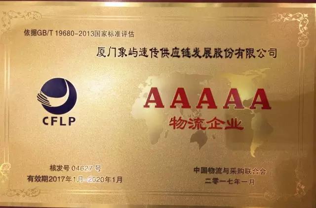 4月7日, 由中國物流與采購聯(lián)合會主辦的“物流企業(yè)授牌大會暨物流業(yè)創(chuàng)新發(fā)展論壇”在云南省昆明市順利召開,會議對本批A級物流企業(yè)進行了集中授牌,象嶼速傳供應(yīng)鏈發(fā)展股份有限公司榮膺最高評級國家AAAAA級綜合服務(wù)型物流企業(yè),成為象嶼旗下繼象嶼股份后第二家獲此殊榮的企業(yè)。