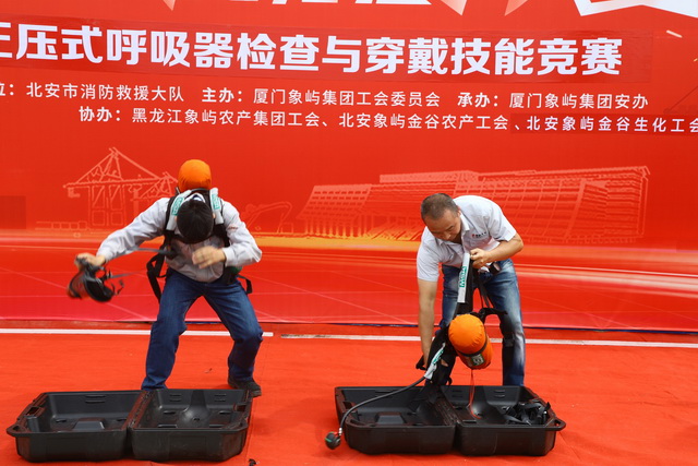 同日,正壓式呼吸器檢查與穿戴技能競賽在北安象嶼產業(yè)園舉行,來自南通、綏化、富錦、北安等地公司的17名選手依次登臺比拼技藝。