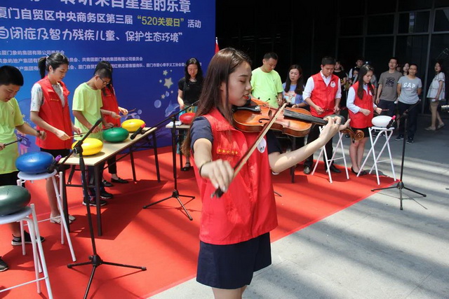 ▲2019年5月,在象嶼集團舉辦的關(guān)愛自閉癥兒童活動中,象嶼志愿者與自閉癥兒童一起表演色空鼓。