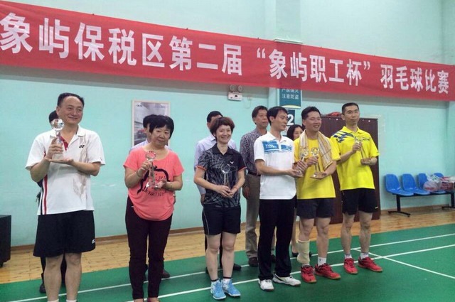 由集團公司胡秋云、傅根海和象嶼建設(shè)集團陳炳忠3人組成的集團公司代表隊,從27支參賽隊伍、6個小組中以小組第一名的成績進入復(fù)賽,并在循環(huán)賽中同樣以第一名的成績挺入決賽,與象嶼海關(guān)代表隊展開最終的冠亞軍之爭。高遠(yuǎn)球、扣殺、劈殺、吊球,運動員在場上打得酣暢淋漓,觀眾們在場下享受視覺盛宴。經(jīng)過數(shù)輪緊張激烈的比拼,集團公司代表隊最終以團體總分第一的成績贏得象嶼保稅區(qū)第二屆“象嶼職工杯”羽毛球比賽第一名,象嶼保稅區(qū)黨工委陳章福副書記為集團公司代表隊頒發(fā)獎杯。這個獎杯不僅是對運動員精湛球技的肯定,更是對他們所彰顯的健康向上的競技風(fēng)貌、追求卓越的象嶼精神的褒獎。同時,速傳物流代表隊以細(xì)致周到的后勤保障、與組委會的良好互動獲得“優(yōu)秀組織獎”。