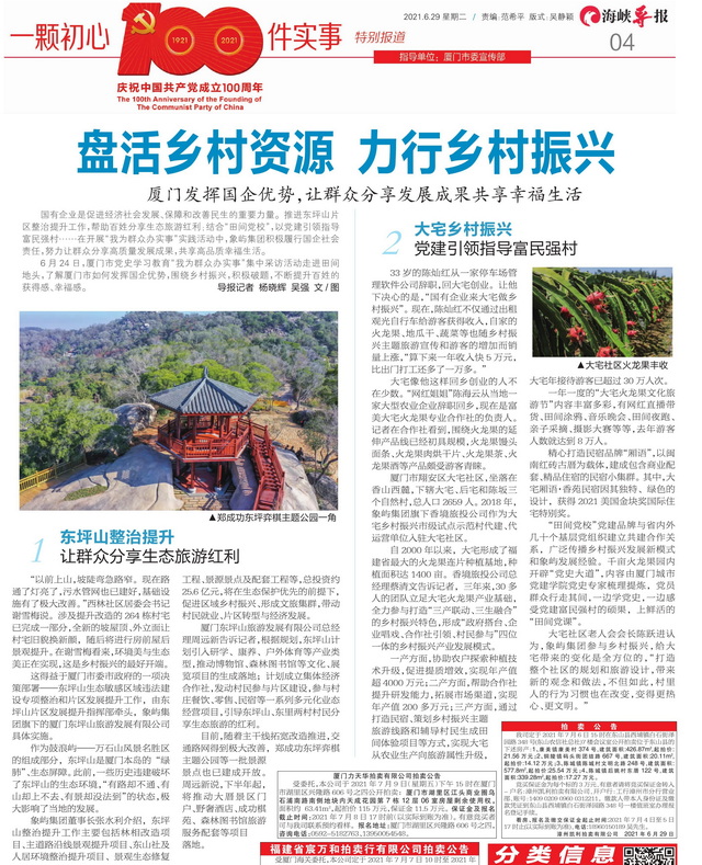 象嶼集團正以“我為群眾辦實事”實踐活動為抓手,深入學習貫徹習近平總書記重要講話精神,著力解決人民群眾急難愁盼問題,為百姓創(chuàng)造美好生活。近日,由廈門市委黨史學習教育領(lǐng)導小組辦公室、廈門市委宣傳部組織的黨史學習教育“我為群眾辦實事”大型蹲點式集中采訪走進象嶼集團。境內(nèi)外近20家媒體深入東坪山發(fā)展提升項目、大宅鄉(xiāng)村振興項目和象嶼慈愛老年養(yǎng)護中心,對象嶼集團辦實事、解民憂、惠民生的創(chuàng)新舉措進行集中報道。