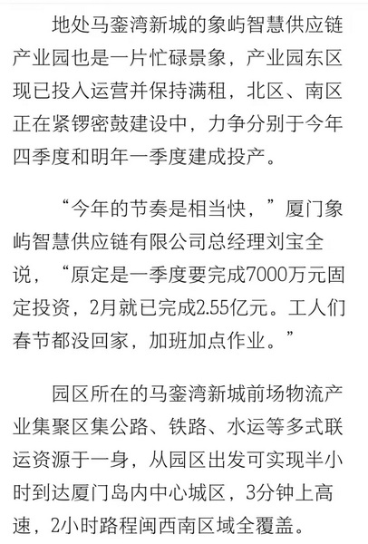 ‘公司在春節(jié)期間動員所有班組不停工,實際完成固定投資2.55億元。’廈門象嶼智慧供應(yīng)鏈有限公司黨支部書記、總經(jīng)理劉寶全介紹,當前,公司正進一步加快項目建設(shè),全力沖刺首季‘開門紅’。”