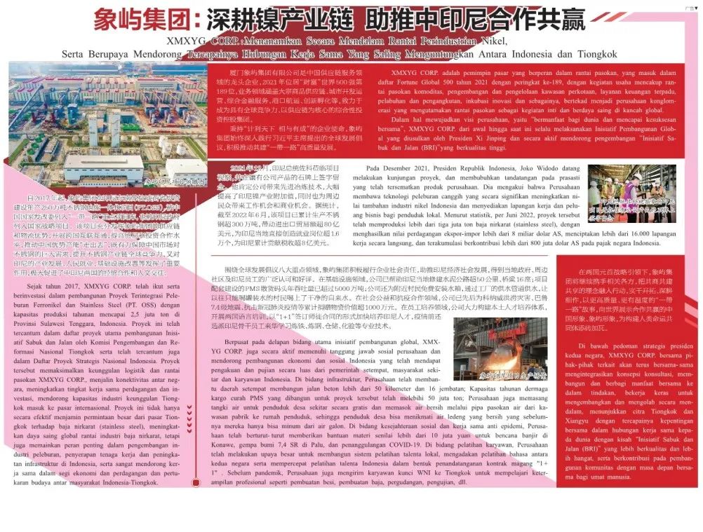 昨天,商務(wù)部《國際商報(bào)》以《象嶼集團(tuán):深耕鎳產(chǎn)業(yè)鏈 助推中印尼合作共贏》為題刊發(fā)專題報(bào)道,介紹象嶼集團(tuán)在印尼投資建設(shè)年產(chǎn)250萬噸不銹鋼冶煉一體化項(xiàng)目,推動(dòng)高質(zhì)量共建“一帶一路”,促進(jìn)中印尼兩國經(jīng)貿(mào)合作和人文交往的突出成效。