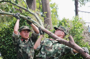 9月19日,子弟兵來(lái)了。這群已經(jīng)為廈門奮戰(zhàn)四天四夜的親人,來(lái)到廈門國(guó)際航運(yùn)中心,攜手象嶼人,一同清運(yùn)兩處景觀公園的斷樹(shù)殘枝。