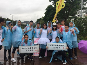 下雨天,依舊湮滅不了象嶼人的熱情。挑戰(zhàn)團隊們紛紛冒雨接受挑戰(zhàn),4位隊員齊心協(xié)力地推動載著17位小伙伴的中巴車。