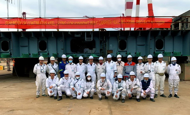 同日下午,象嶼海裝分別為日伸海運株式會社和日本洞雲(yún)汽船公司建造的63500載重噸系列散貨船ZZ088和ZZ069在船塢舉行鋪龍骨儀式。