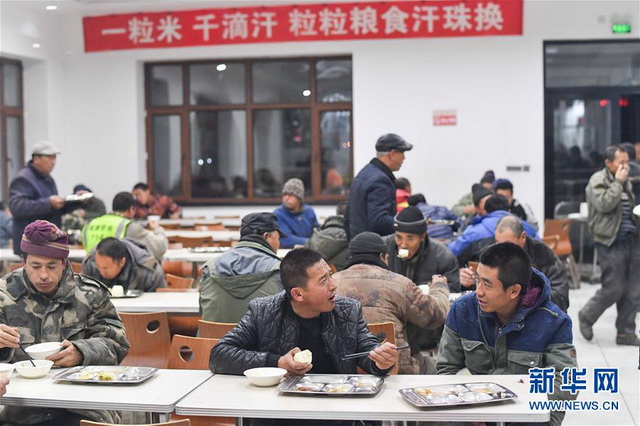 在黑龍江北安市的北安象嶼金谷農產有限責任公司免費餐廳中,糧農們邊用晚餐邊等待過磅、卸糧、結算